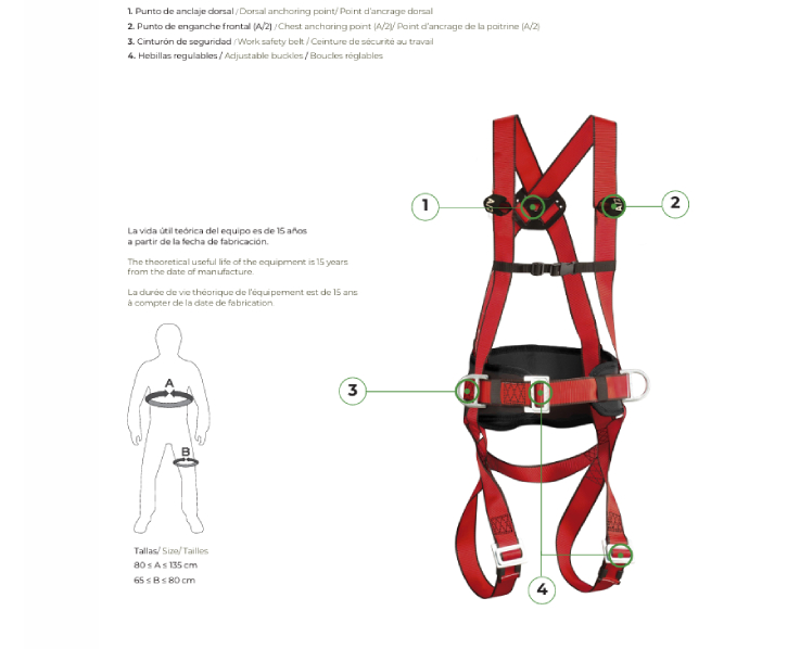 El arnés dispone de un punto de anclaje anticaídas a (A) dorsal (nº1) en hebilla D de acero de 8 mm y un punto de enganche anticaídas frontal (nº2) compuesto por dos bagas de tejido para conectar un sistema anticaídas (A/2).